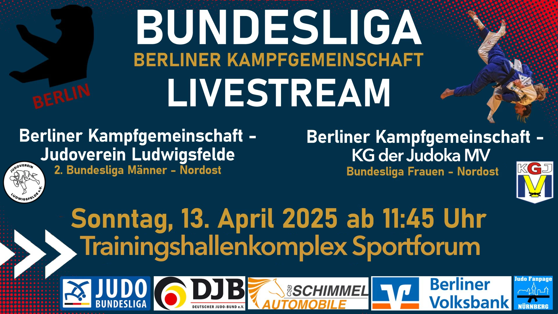 Am Sonntag, 13. April 2025, 12 Uhr, überträgt die Berliner Kampfgemeinschaft ihren ersten Doppel-Heimkampftag 2025 aus dem Sportforum Berlin.