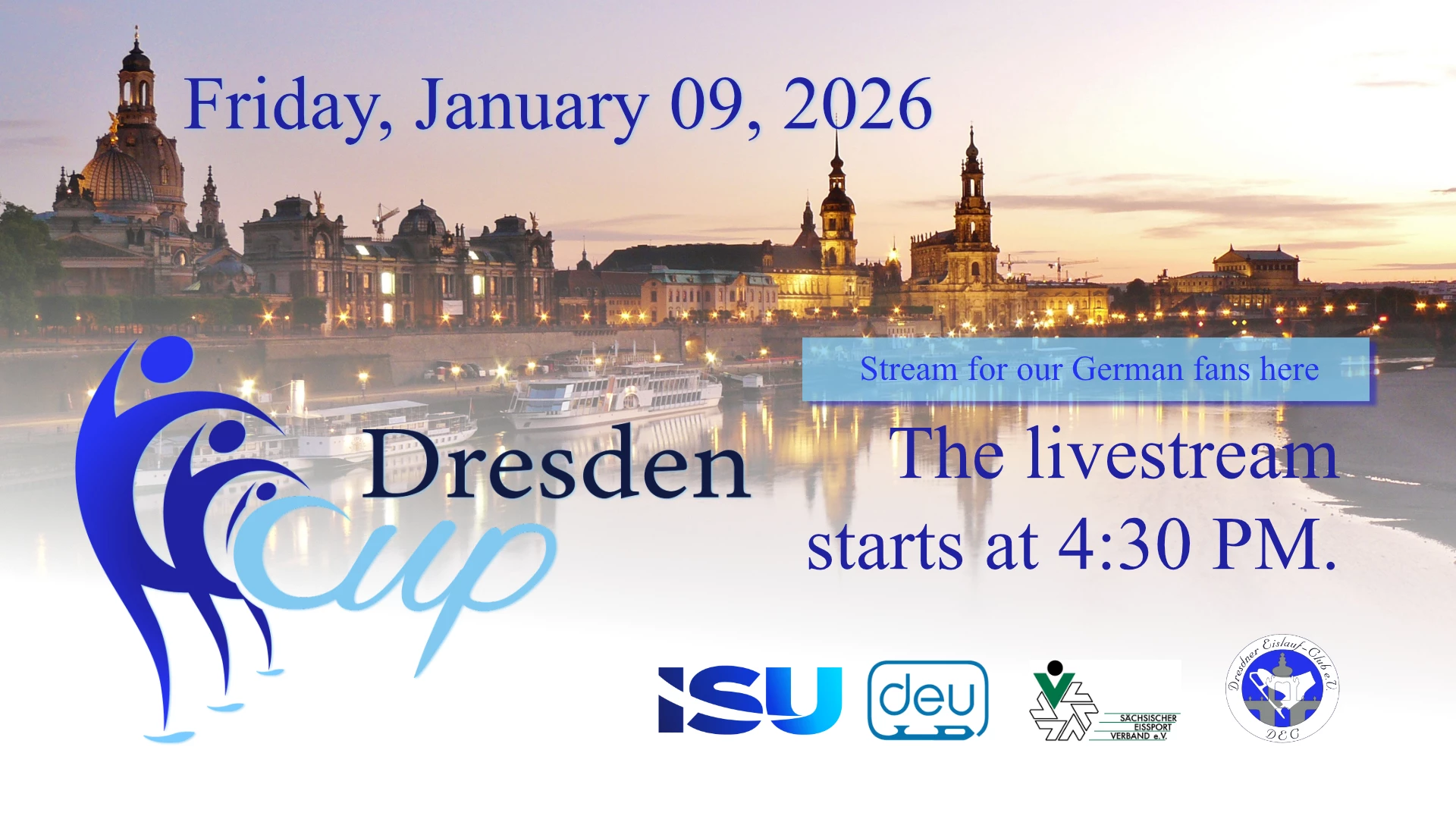 Für unsere Fans aus Deutschland: Gemeinsam mit dem Dresdener Eislauf-Club e.V. präsentiert die Deutsche Eislauf-Union e.V. den DresdenCup 2026. Von Freitag, 09.01. bis Sonntag 11.01.26 Synchroneiskunstlaufen live aus der JoyNext Arena Dresden.
