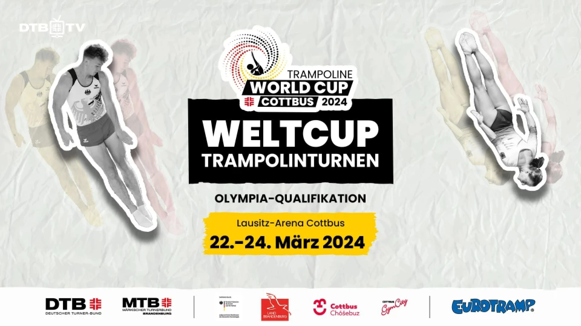 Vom 22. bis zum 24. März 2024 wird Cottbus mit der Lausitz-Arena der Austragungsort für ein Turnier der Serie des Weltturnverbandes FIG sein. Der Wettbewerb in der Lausitz ist zudem Bestandteil der Olympia-Qualifikation und erhält dadurch besondere sportliche Brisanz. | Zeitplan: Freitag, 22.03.24 10:00 - 19:15 Uhr Einzel Frauen und Männer Qualifikation | Samstag, 23.03.24 14:15 - 16:45 Uhr Synchron Frauen und Männer Qualifikation 17:45 - 19:30 Uhr Einzel Frauen und Männer Halbfinale | Sonntag, 24.03.24 14:15 - 15:40 Uhr Einzel Frauen und Männer Finale 15:40 - 16:50 Uhr Synchron Frauen und Männer Finale #dtb#trampolin#turnen#cottbus