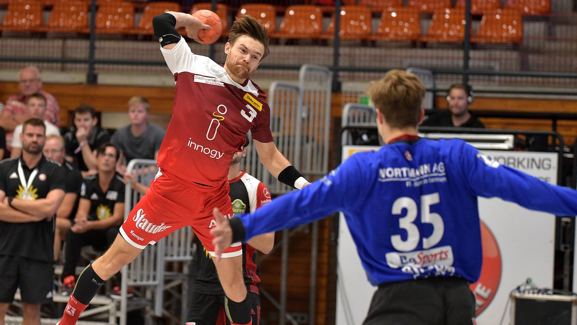 In der Partie der 2. Handball Bundesliga zwischen TuSEM Essen und HSG Nordhorn-Lingen erzielt Kapitän Jonas Ellwanger das Tor trotz krassem Bodycheck.