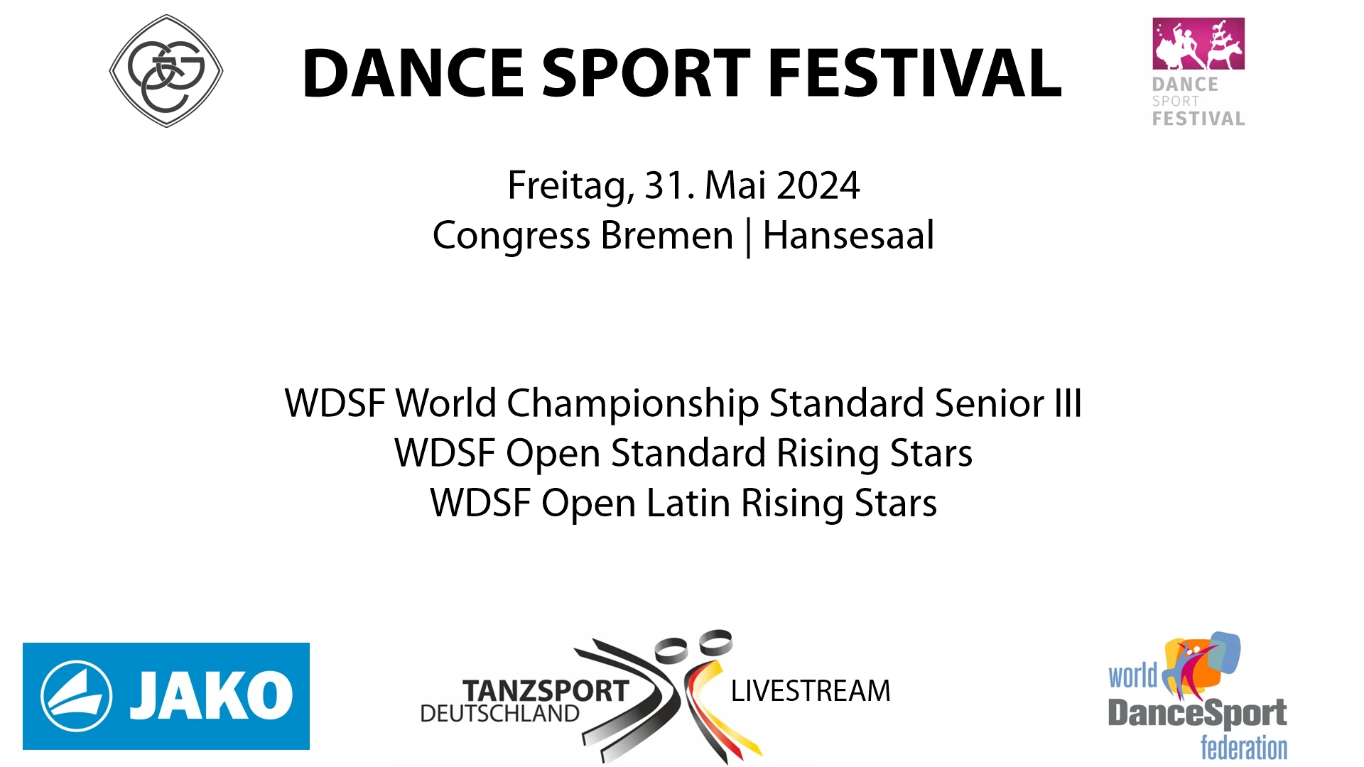 Der Grün-Gold-Club Bremen richtet im Rahmen seines Dance Sport Festival am 31.05.2024 im Hansesaal des Congress Bremen die WDSF Weltmeisterschaft der Altersgruppe Senior III in den Standardtänzen aus. Ergänzt wird das Tagesprogramm durch zwei WDSF Open Turniere.