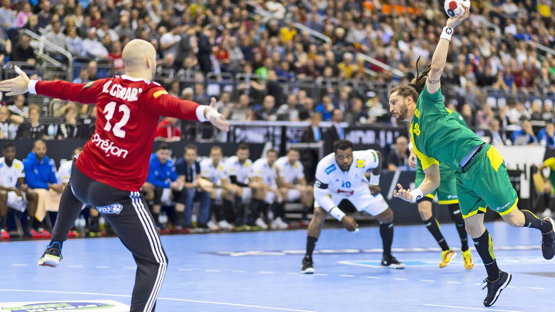 Der französische Torhüter beweist Extraklasse gegen Brasilien! Nachdem Siebenmeter gepfiffen wird, gibt es für Brasilien kein Durchkommen. Sportdeutschland.TV zeigt alle 96 Spiele der Handball-Weltmeisterschaft vom 10. bis 27. Januar live und on demand. Die deutschen Spiele gibt es im Freemium-Paket “Sportdeutschland.TV Plus”. Hier gibt es den kompletten WM-Spielplan