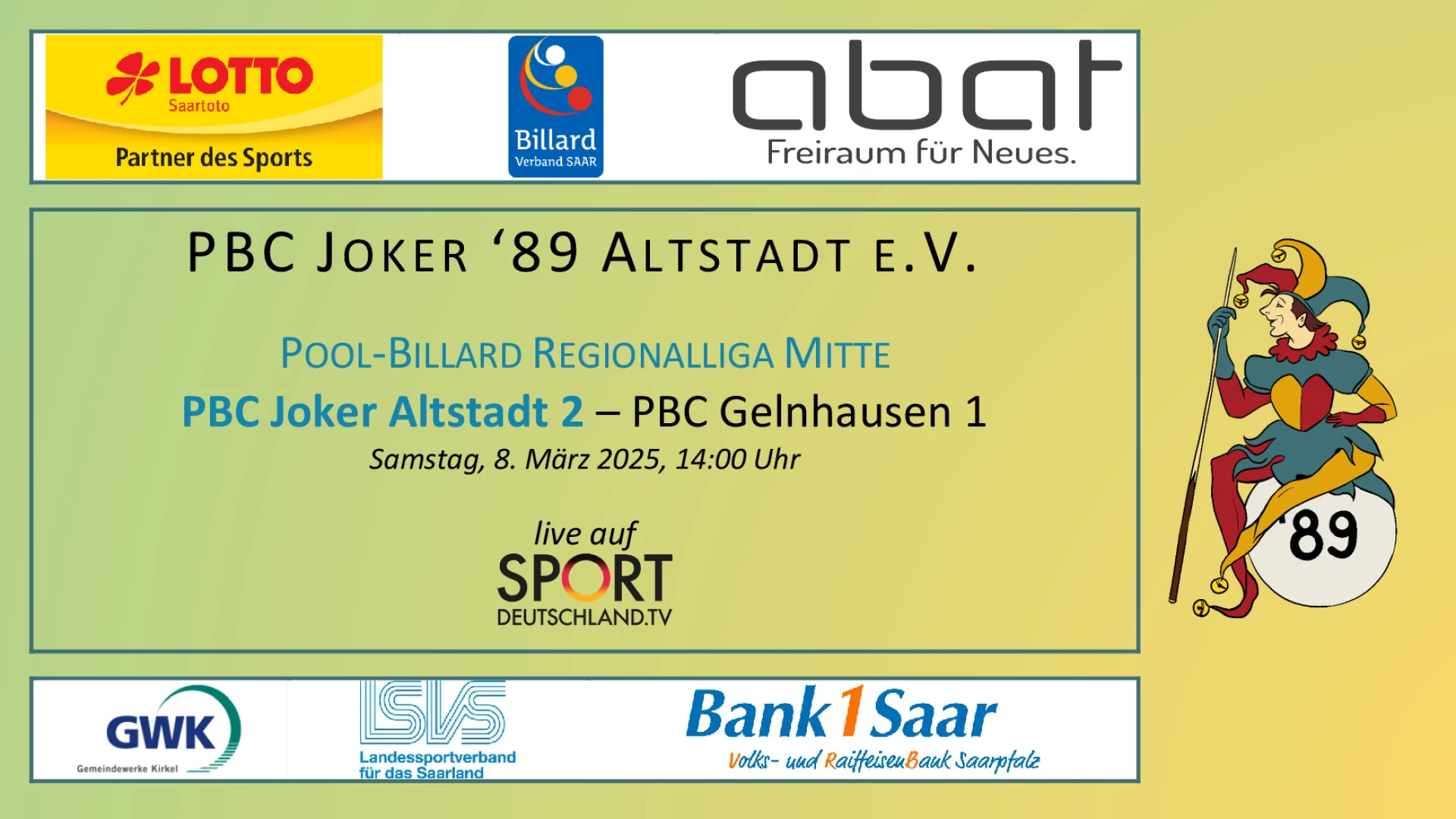 An diesem Wochenende haben wir die beiden Nicht-BVS-Mannschaften der Pool-Billard Regionalliga Mitte zu Gast. Am Samstag, dem 08.03.2025 spielt unsere zweite Mannschaft als Tabellenführer gegen den PBC Gelnhausen 1! Falls ihr es nicht schafft, schaut gerne den Stream. Und folgt uns bei Facebook unter Facebook.com/JokerAltstadt