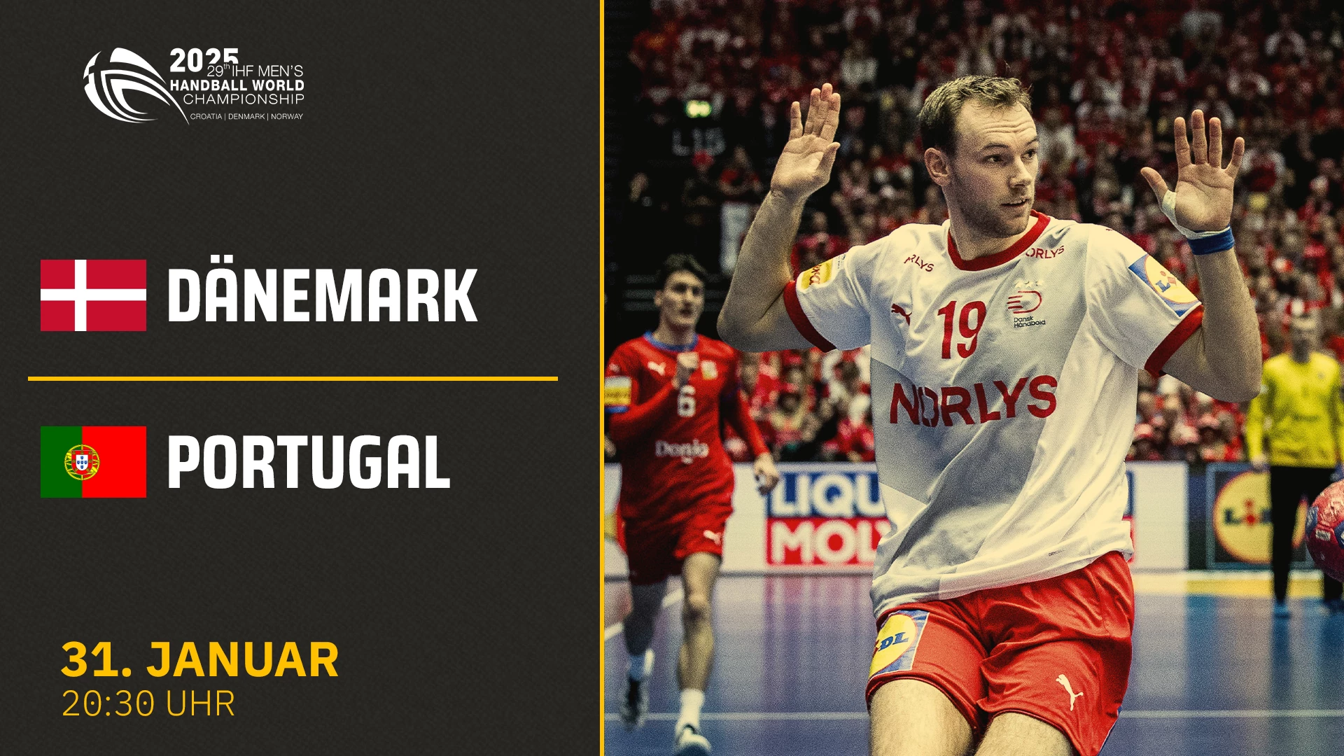 Video-Livestream des Halbfinalspiels zwischen Dänemark und Portugal im Rahmen der Handball-WM der Männer 2025 am 31.01.2025 um 20:30 Uhr. #handball #handball #handballwmmaenner2025 #CRODENNOR2025 @sportdeutschlandtv