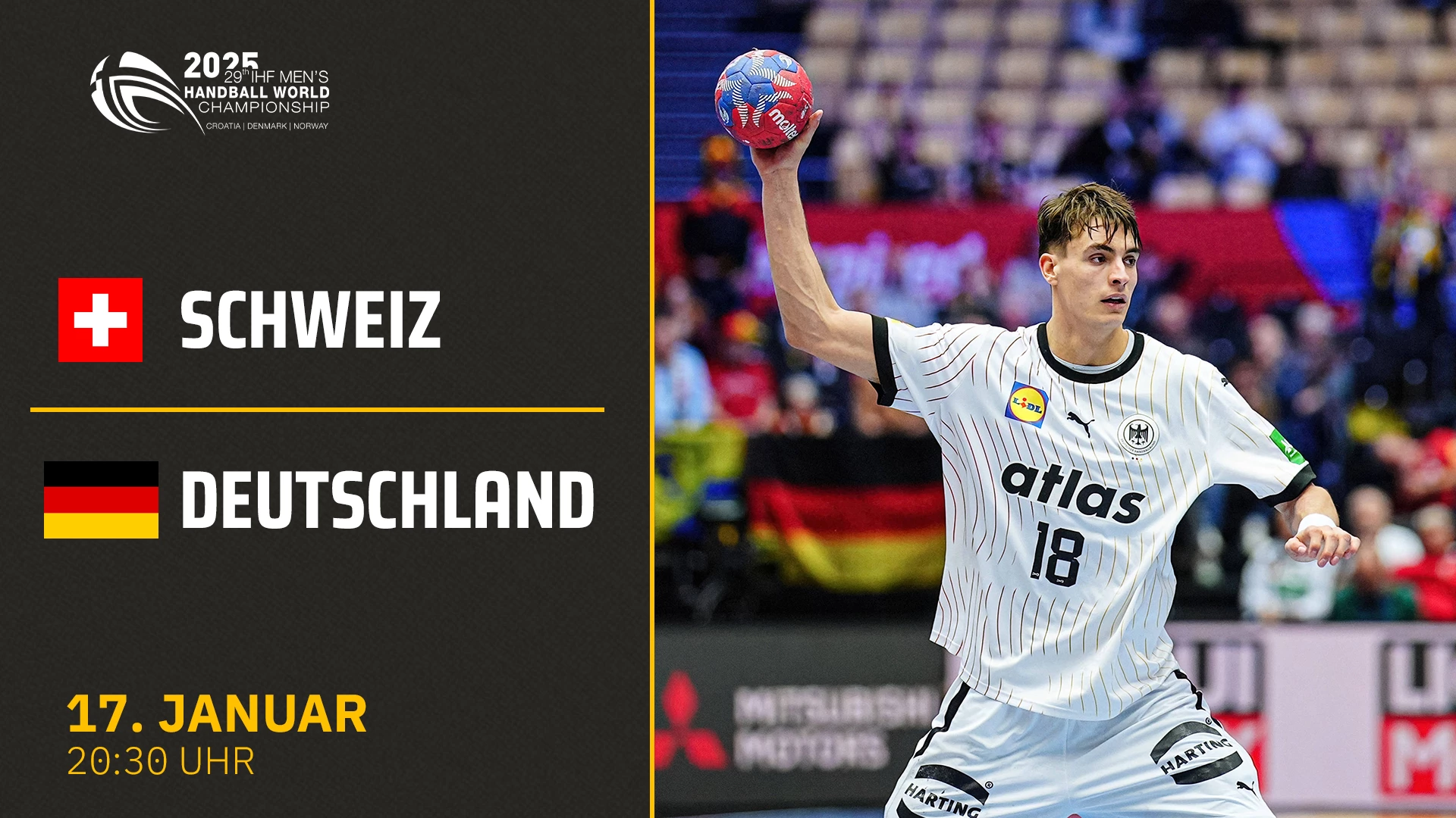 Video-Livestream des Vorrundenspiels zwischen Schweiz und Deutschland im Rahmen der Handball-WM der Männer 2025 am 17.01.2025 um 20:30 Uhr. #handball #handballwmmaenner2025 #CRODENNOR2025 #aufgehtsdhb #wirihralle #dhb @deutscherhandballbund @sportdeutschlandtv