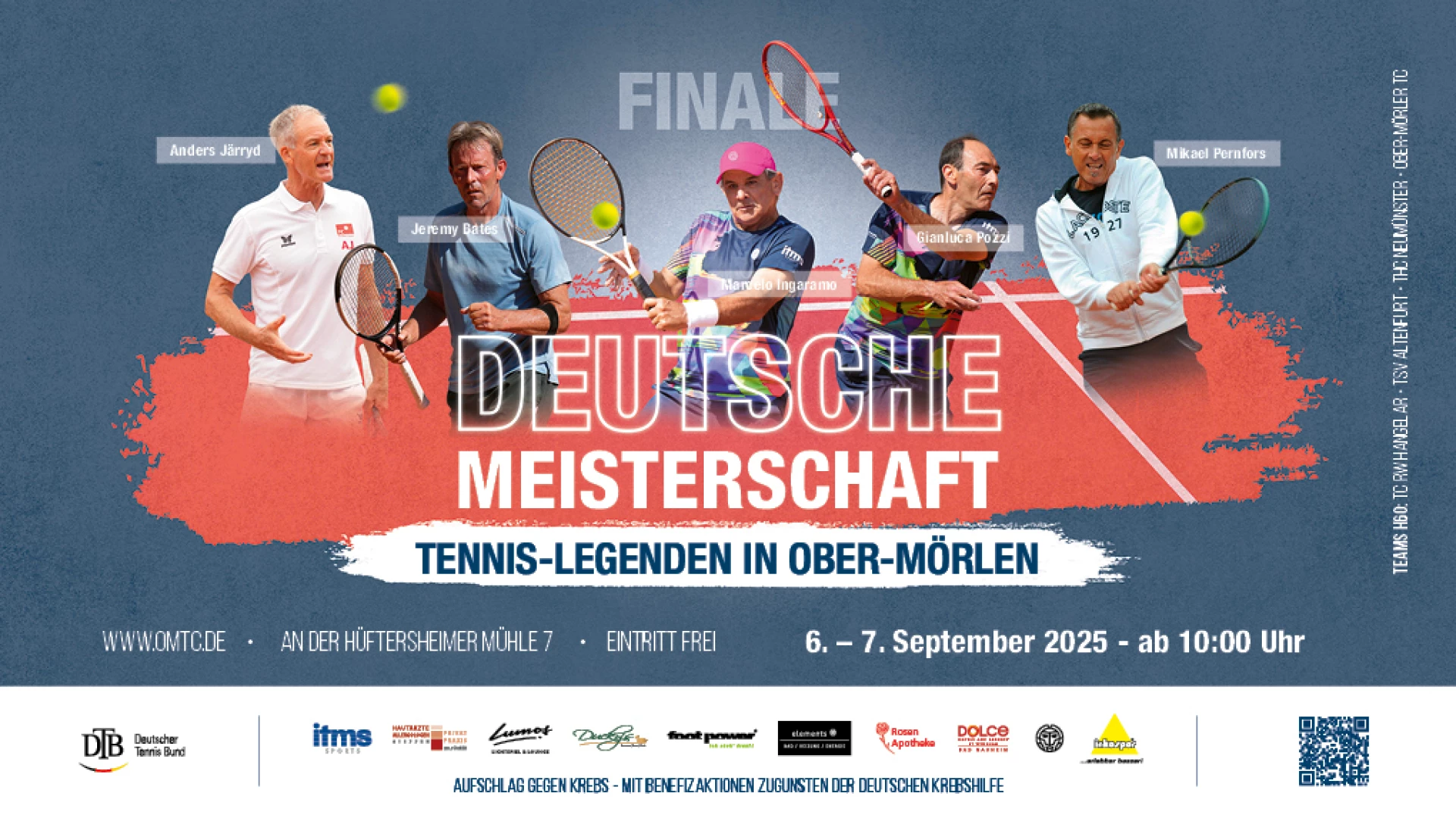 Am ersten September-Wochenende (6. + 7. 09.) ist es soweit: Der Ober-Mörler Tennis-Club richtet mit den Deutschen Meisterschaften erstmals ein nationales Top-Turnier auf heimischer Anlage aus. Ehemalige ATP-Stars, deutsche Spitzenspieler, Tennislegenden und internationales Flair kommen auf die Anlage an der Hüftersheimer Mühle, um das Final Four der Deutschen Vereinsmeisterschaften der Herren 60 auszutragen – ein Event der Extraklasse.