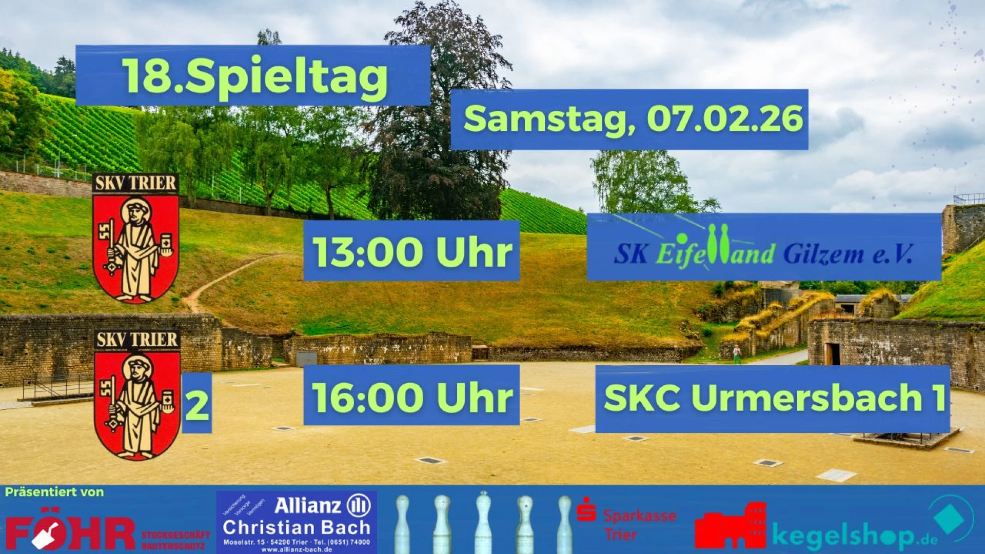 18. Spieltag 1. BuLi 13:00 Uhr SKV Trier 1 - SK Gilzem 1 18. Spieltag RLP-Liga 13:00 Uhr SKV Trier 2 - SKC Urmersbach 1