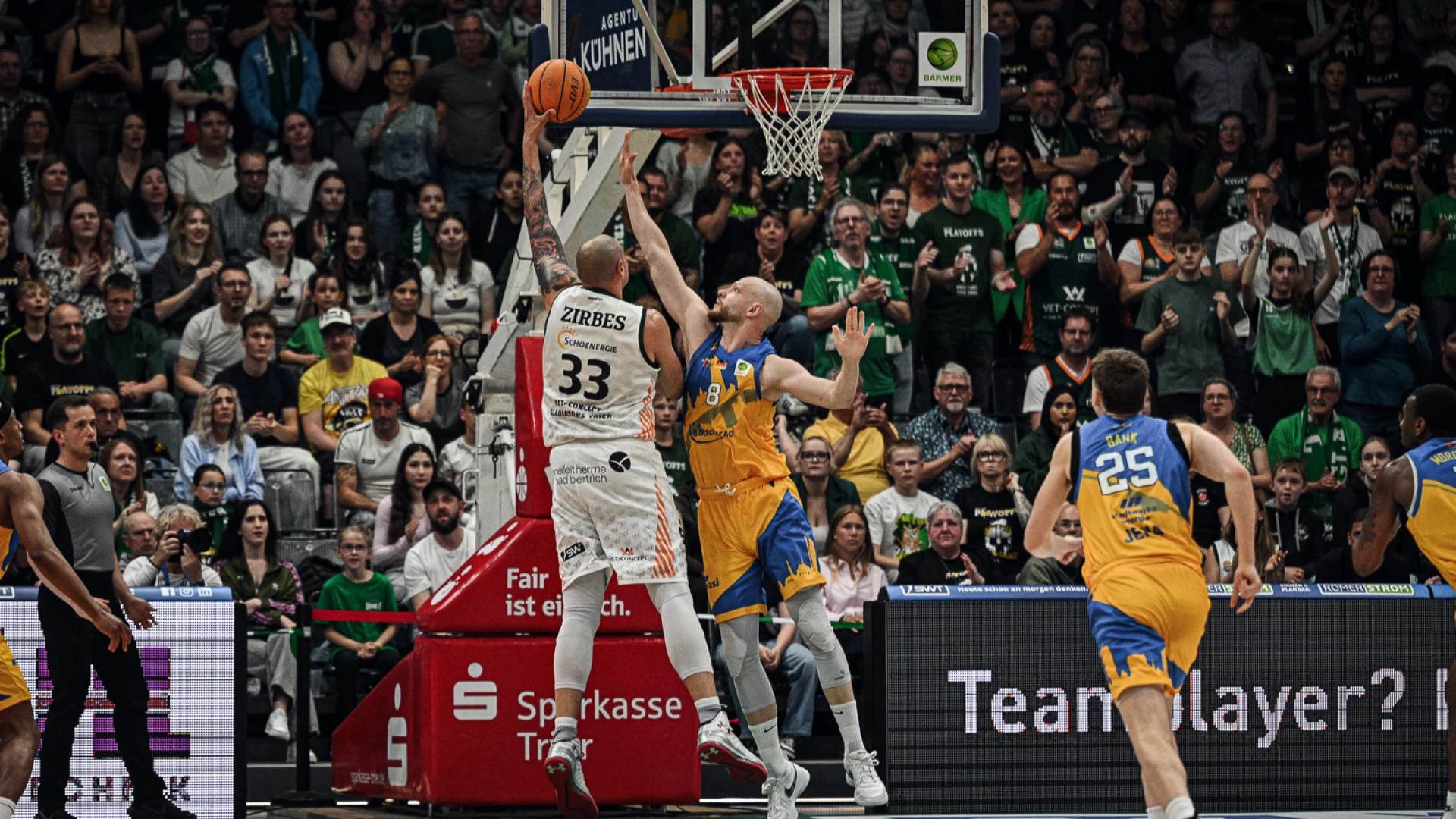 Vor knapp 4.600 Zuschauern in der SWT Arena emfpingen die @vetconcept-gladiators-trier das Team von @sc-jena im ersten Finalspiel der @barmer-2-basketball-bundesliga . Hier sind die schönsten Trierer Szenen im Play of the Day.